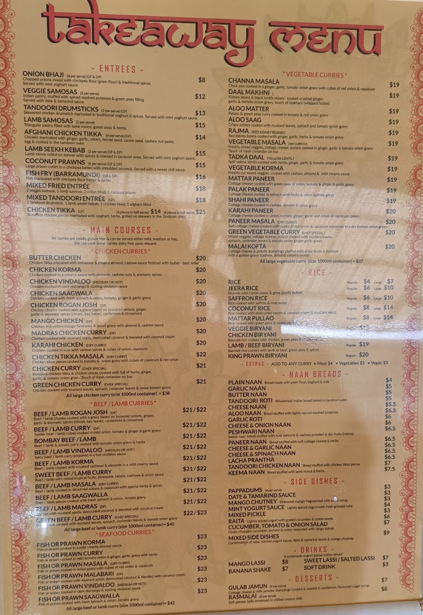 To complement these rich curries, the naan bread selection is diverse and satisfying, ranging from Plain Naan, Butter Naan, and Garlic Naan to Cheese Naan and the traditional Tandoori Roti, perfect for soaking up every last drop of sauce. Side dishes like Pappadums, Date & Tamarind Sauce, Mango Chutney, Mint Yogurt Sauce, and Mixed Pickle add layers of flavor and texture, enhancing the overall dining experience. Vegetarian diners are equally well catered for with hearty mains such as Channa Masala, Daal Makhni, Aloo Matter, Vegetable Masala, and Vegetable Korma, showcasing depth and balance without compromise.
